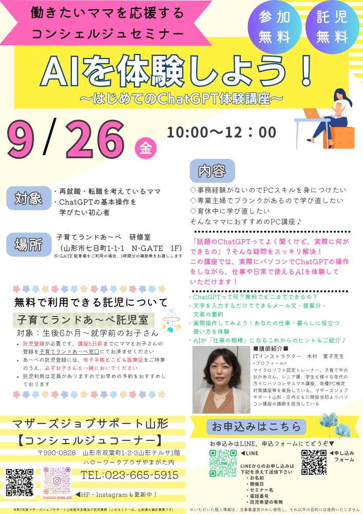 コンシェルジュPC講座「AIを体験しよう!」を開催します!◇:*:☆:*:◇:*:☆:*:◇:*:☆:*:◇:*:☆:*:◇・実際にパソコンを使ってChatGPTを 操作しながら、仕事や日常で使える AIを体験できます。・ChatGPTってよく耳にするけど何?・実際操作してみよう。あたなの仕事・ 暮らしに役立つ使い方を体験しよう! 【日時】 9月26日(金) 10:00〜12:00 【会場】 子育てランドあ〜べ 研修室【定員】 10名【託児】 あり 定員があります お早めにご予約ください【受講料・託児料】 無料 ご興味のある方はお早めにお気軽にお問合せください♪ □お問い合わせ□マザーズジョブサポート山形【コンシェルジュコーナー】◇電話でのお申込み→023-665-5915◇お申込みメール→コチラ◇LINEでのお申込み→トーク画面にて・お名前・お申込み講座・託児の有無・お電話番号を送信してください。返信をもって申込完了となります。↓公式LINE追加はこちら↓☆メール・LINE・電話での対応は 開庁日のみとなります。 メール、LINEは開庁時間内で 返信いたします。