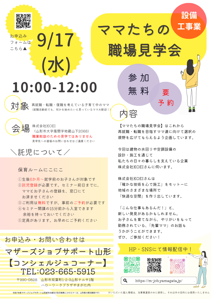 令和7年度1回目の「ママたちの職場見学会」を開催します! この見学会はこれから再就職・転職を目指すママたちに向けて選択の視野を広げてもらえるよう企画しています。 :*:☆:*:◇:*:☆:*:◇:*:☆:*:◇:*:☆:*:◇ 世の中には、いろんな職場があっていろんな仕事があって、いろんな場面でママたちが頑張っています! 日頃、目にすることができない職種のお仕事をその目でご覧になってお仕事探しの参考にしませんか? 第1回目は「 設備工事業 」です!私たちの日々の暮らしを支えている建物の水回りや空調設備の設計・施工などをしているお仕事です☆ぜひ一緒に、見学に行ってみましょう!子育てしながら勤務されている「先輩ママ」の経験談も聴けますよ! -------------------------------------【日時】9月17日(水)10:00〜12:00※移動はタクシーに便乗いただきます【会場】株式会社KOEI【託児】あり【参加料・託児料】無料-------------------------------------□お問い合わせ□マザーズジョブサポート山形【コンシェルジュコーナー】◇電話でのお申込み→023-665-5915◇お申込みメール→コチラ◇LINEでのお申込み→トーク画面にて・お名前・お申込み講座・託児の有無・お電話番号を送信してください。返信をもって申込完了となります。↓公式LINE追加はこちら↓☆メール・LINE・電話での対応は 開庁日のみとなります。 メール、LINEは開庁時間内で 返信いたします。