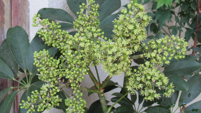 ●近所の鉢植えが何年かぶりで花が咲きましたと教えていただきました「カポック」の名前の観葉植物だそうです 葉を大きく広げる様子がとても素敵で温度や湿度や日当たりなどもあまり気にせず生長するため育てやすいそうです よく見る観葉植物です