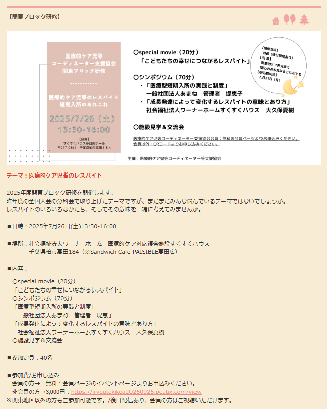 https://www.iryoutekikea.net/cont6/main.html医療的ケア児等コーディネーター支援協会より研修のお知らせです。「2025年度関東ブロック研修」が開催されます。テーマは「レスパイト」です。山形県に限らず、全国各地で悩んでいるテーマではないでしょうか。医療的ケア児者のレスパイト、いろいろなかたち、そしてその意味を一緒に考えてみませんか。日時:2025年7月26日(土)13:30-16:00場所:社会福祉法人ワーナーホーム 医療的ケア対応複合施設すくすくハウス 千葉県柏市高田184(※Sandwich Cafe PAISIBLE高田店)〇special movie(20分) 「こどもたちの幸せにつながるレスパイト」〇シンポジウム(70分) ・「医療型短期入所の実践と制度」 一般社団法人あまね 管理者 堤恵子 ・「成長発達によって変化するレスパイトの意味とあり方」 社会福祉法人ワーナーホームすくすくハウス 大久保夏樹〇施設見学&交流会参加定員:40名※有料の研修会となっています。後日配信があり、会員の方はご視聴いただけます。※関東地区以外の方もご参加可能です。(医療ソーシャルワーカー)