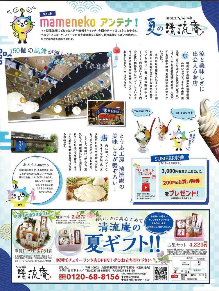 風にゆれる150個の風鈴が...涼しげな音色でみなさまをお出迎えしてくれます。 とうふ 油揚げ がんも 豆乳などからだに優しい大豆食品を揃えています。・ヘルシーなスイーツ・夕飯のおかず・おうち飲みにピッタリな一品 夏の期間中は 3000円お買い上げごとに200円のお買い物を券プレゼント(送料は含みません) おいしさに真心込めて清流庵の夏ギフトも多数ご用意しております。