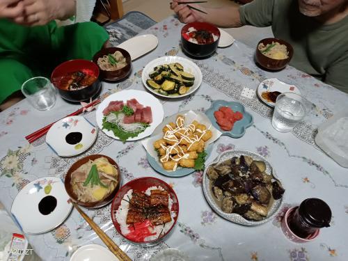 我が家で行うギター練習は月2回、毎月開催日は異なりますが、2018年から8年目を迎える・・以前は仕事終わってから夜7時開催でしたが、今は仕事も週3日程度のアルバイトであるので基本休みの日に午後4時集まり、夕飯準備し、夕食しながら雑談そして練習となる、今月は11日と22日で、22日は土用の丑に近くウナギと肉じゃが、ナス素揚げ、ズッキーニ炒めとたらこに刺身がついて・・お酒飲んだ人はお泊りですね・・この日は我が家のスイカと、プリンスメロンがデザートに付く・・毎回何にするかも楽しみつつやってます・・年に1回だけ発表会する・・今年どこでやるかはでき次第です・・