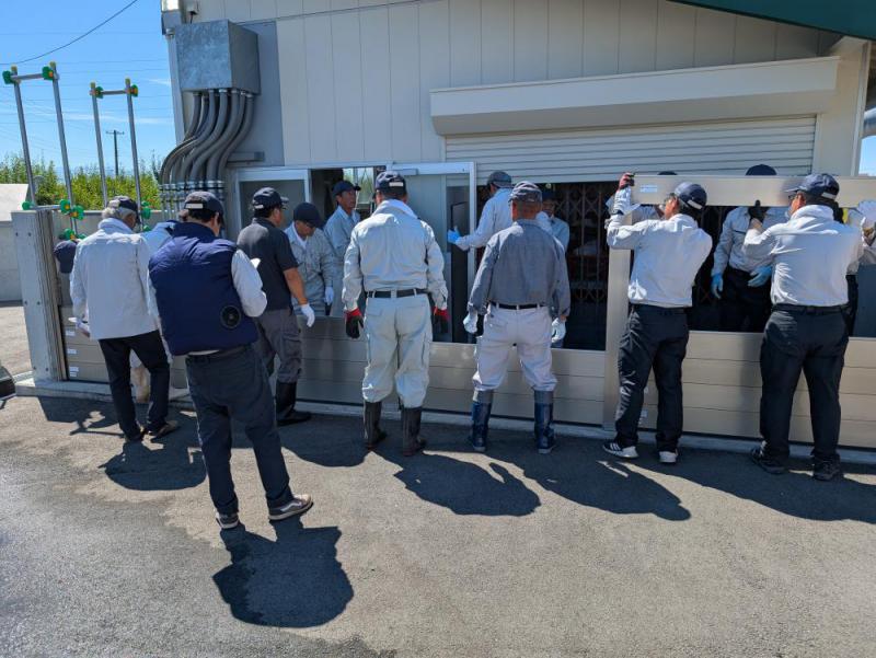 令和7年7月24日(木)三郷堰中山揚水機場において、頻発化・激甚化する異常気象から施設を守るため、事前行動計画に沿った対応を確実に実施できることを目的として役職員及び管理委員の総勢32名の参加により実施しました。また、河川水位上昇時場内への防水・排除及び管内施設の防災対策強化及び防災対応力の向上を重点に実施しました。令和2年災害のような内水被害を想定し、浸水防止板の設置訓練や業務委託者による緊急排水訓練など連絡方法や動員方法、手順など事前防災行動計画に沿って対応することを確認し行いました。暑い中訓練お疲れさまでした。