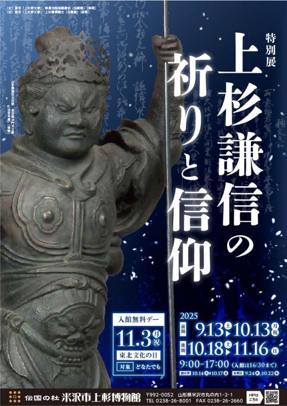 9月13日(土)よりはじまる特別展のお知らせです。 特別展「上杉謙信の祈りと信仰」  戦乱が数多く繰り広げられた戦国時代は、戦勝を祈念する軍神が一挙に勃興した時代でもありました。この軍神を信仰する形は、武将が身にまとう武具や刀剣に意匠として施されています。上杉謙信も飯縄権現や毘沙門天等の神仏を篤く信仰しており、謙信ゆかりの工芸品にその様相がうかがえます。 また、上杉家は真言宗を信仰する全国的にも数少ない大名家です。この発端は謙信と高野山との密接な関係に求められ、謙信への崇敬とともに江戸時代に引き継がれていきます。特に、米沢城本丸に設けられた御堂は、謙信への崇敬がうかがえる代表的な事例であり、全国的に見ても珍しい城の造りと言えます。 本展では、上杉謙信が信仰した軍神や宗教を主軸に置き、その後米沢藩上杉家に引き継がれていく信仰のかたちを、主に謙信にゆかりある多様な文化財から紹介します。  【会期】前期:9月13日(土)〜10月13日(月・祝)    後期:10月18日(土)〜11月16日(日)     ※展示替え:10月14日(火)〜10月17日(金) 【休館日】9月24日(水)、10月22日(水) 【開館時間】9:00〜17:00(チケット販売は16:30まで) 【入館料】一般800円(640円)/高大生500円(400円)/小中生300円(240円)    ※( )は20名以上の団体料金    ※常設展とのセットのみ販売 【ギャラリートーク】担当学芸員による展示解説 ※申込不要 日   時 : 【前期】9月13日(土)、10月4日(土)         【後期】10月18日(土)、11月8日(土)         いずれも14:00〜 会   場 : 上杉博物館 企画展示室 定   員 : なし    参 加 費 : 特別展入館料 担   当 : 池野 理(当館学芸員) 【講演会】 ※9月10日(水)9:00より申込受付開始「謙信の軍神、軍神の謙信」 日   時 : 10月25日(土) 14:00〜 会   場 : 伝国の杜 2階大会議室 定   員 : 80名 参 加 費 : 無料 講   師 : 早稲田大学社会科学総合学術院教授 黒田 智 氏  お申し込みは 申込TEL:0238-26-8001         申込Mail:welcome@denkoku-no-mori.yonezawa.yamagata.jp   ※メールでお申込みの際は、聴講される方全員の【名前、住所、電話番号】を明記してください。  特別展の主な展示資料等、詳しくは当館ホームページをご覧ください。 皆様のご来館を心よりお待ちしております! 【お問い合わせ】 米沢市上杉博物館  0238-26-8001