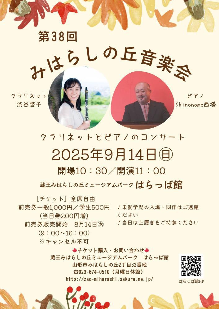 開場10:30~、開演11:00~、終演予定12:00、蔵王みはらしの丘ミュージアムパーク「はらっぱ館」にて「みはらしの丘音楽会」を開催します。 クラリネットは渋谷啓子さん、ピアノはShinonome西塔です。私(Shinonome)が渋谷さんの略歴を読んだ感想は、「2017年よりアレクサンダーテクニックを学び、音楽をする人たちの健やかでハッピーなココロとカラダのサポートを行っている」そうで、いったいどんな事をしているのだろう、心惹かれるな!と思いました。ちょうど、明日、「合わせ」の練習で見えられるので、お聞きしたい、と思っています。 プログラムは、以下に添えます。1 ドビュッシー:月の光(ピアノソロ)2 マンガーニ:クラリネットのためのテーマ3 山田耕筰:赤とんぼ4 坂田晃一:NHK連続テレビ小説「おしん」より テーマ曲5 ロルフ・ラヴランド:You Raise Me Up6 大村雅朗:スウィート・メモリーズ(松田聖 子)7 サラサーテ:カルメンファンタジー 以上になります。最後にみなさんで歌える曲を準備中です。(歌詞カードをこちらで準備する予定です) チケット購入、お問い合わせは、「はらっぱ館」、Shinonome西塔、渋谷啓子さんになります。また、添付のチラシをよくお読みの上いらしてくださいね!おそらく、チラシは指で拡大できると思います。(不便な場合は、お三方から『紙』のチラシをお受け取りください。) 今から演奏できるのを楽しみにしてます、みはらしの丘に響くクラリネットとピアノのハーモニーを、是非「至近距離」で味わってください。