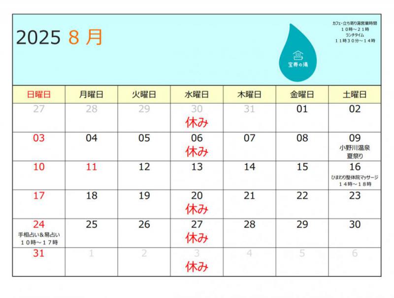 今月の営業カレンダーになります。8月はお盆期間、お休みせず、営業していきます。本来13日(水)が水曜日なので、定休日のところですが、休まず、がんばります。9日(土)が小野川温泉の夏祭りということで、夜、盆踊りが行われます。ぜひ、みんなで踊りましょう〜