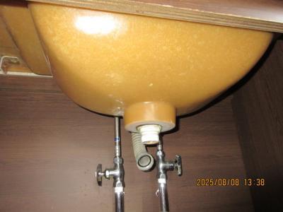 こんにちは。松田です。暑さが続いていますが、いかがお過ごしでしょうか?体調には十分お気をつけてお過ごし下さい。今日は、洗面台排水から水漏れしていると連絡があり、訪問しました。40年以上前の洗面台。洗面台の下から水漏れしています。買い替え時期ですが、水漏れしないようにできないか?!と施主様よりご相談ありました。修理する部品ももうありません。さて、どうするか??両面テープで巻き、上からビニールテープを巻き、その上からアルミテープを巻きました。水漏れは止まりました。ひとまず、安心です。施主様も喜んで下さいました。