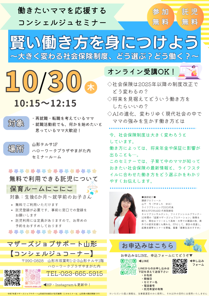 『賢い働き方を身につけよう〜大きく変わる社会保険制度、どう選ぶ?どう働く?〜』 セミナー10月開催のお知らせです。◇:*:☆:*:◇:*:☆:*:◇:*:☆:*:◇:*:☆:*:◇今社会保険は大きく変わろうとししています。働き方によっては、将来年金や保証に影響が出ることも…このセミナーでは、こ育て中のママが知っておきたい社会保険の最新情報と、ライフスタイルに合わせた働き方をどう選ぶかをわかりやすくお伝えします。 オンラインでの受講も可能です!●ご自宅でオンライン受講ご利用の方へ●・インターネット環境が必要になります。 通信料は自己負担です。・パソコン、スマートフォン、 またはタブレットで受講できます。・スマホまたはタブレットをご利用の方は 事前にZoom meetingsを ダウンロードしてください。・セミナー中はカメラをオンにし、 お顔の見える状態で受講して下さい。 また、マイクで会話による現状確認が できる形でご受講をお願いしております。 ☆--- -- -- -- -- -- -- -- -- -- --☆【日時】10月30日(木)10:15〜12:15【講師】キャリアコンサルタント・ファイナンシャルプランナー山下 弓 氏 【会場】ハローワークプラザやまがた内セミナールーム または ご自宅でオンライン受講 (zoom使用)【託児】セミナールームで受講の方のみ利用できます。定員がありますので、お早めにご予約ください。【受講料・託児料】 無料 ☆ご自宅にてオンライン受講の方は、 zoom通信料等はご自身負担になります。☆--- -- -- -- -- -- -- -- -- -- --☆お問い合わせは…マザーズジョブサポート山形コンシェルジュコーナーTEL:023-665-5915申込みメールはコチラLINEでお申し込みの場合は「お名前、電話番号、申込み講座名、受講方法、託児の有無」を送信してください。マザーズジョブサポート山形コンシェルジュコーナーからの返信をもって申込受付完了となります