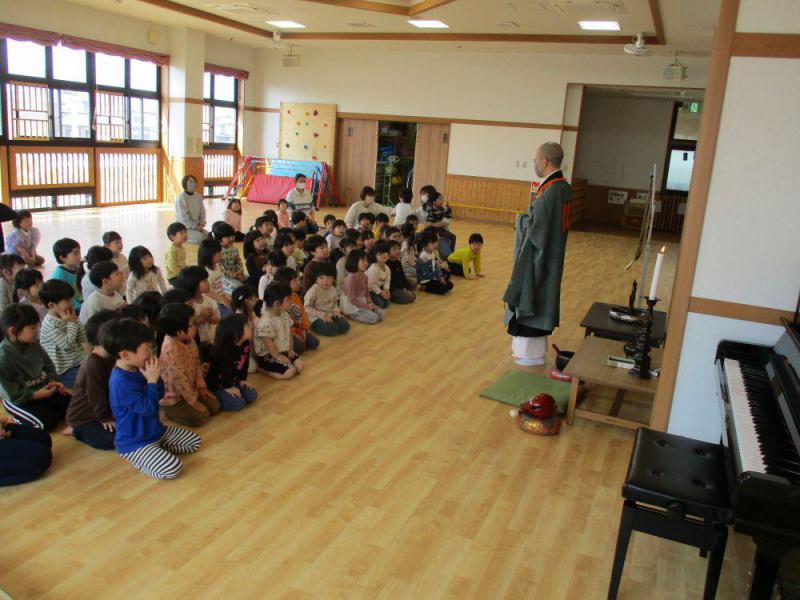4月8日はお釈迦様がお生まれになった日です。関興庵の窪副住職にお経をあげていただき、お釈迦様がお生れになった時の話をお聞きしました。最後にお釈迦が生まれる際、九頭の龍が天からあらわれ、お釈迦様の頭から甘露の雨を注いだという言い伝えに基づき、誕生仏に甘茶をかけ、お釈迦様の誕生日を祝いしました。その後みんなが健康に育ちますようにと同じ甘茶をいただきました。