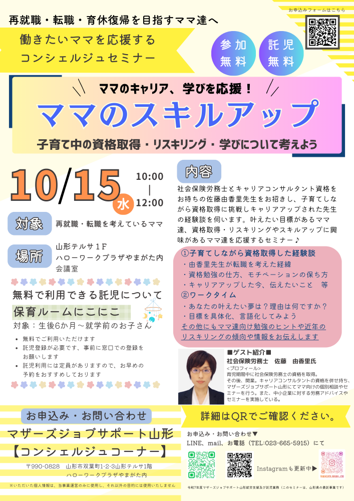 10月のコンシェルジュセミナーのお知らせです! 『ママのキャリア、学びを応援!ママのスキルアップ』今回のセミナーのゲストは社会保険労務士・キャリアコンサルタントの佐藤由香里先生です♪ *.:・.。**.:・.。**.:・.。**.:・.。**子育て毎日お疲れさまです日々子育てに忙しいママ達ずっと胸に秘めている勉強してみたい資格はありますか?チャレンジしてみたい仕事はありますか?叶えたい夢はありますか?子育てしながらでもきっと出来る、叶えられる。ママの人生の満足度をあげてくれる「勉強=スキルアップ」についてのお話聞いてみませんか?子育てしながら社会保険労務士・キャリアコンサルタントを取得された佐藤由香里先生と共にママ達の『成長したい!』を応援するセミナーです♪ ・佐藤由香里先生の体験談・ワークの時間・ママ達向けの勉強のゴクイ・スキルアップに関する情報提供などなど♪是非気軽にご参加くださいね。 【日時】令和7年10月15日(水) 10:00〜12:00【会場】ハローワークプラザやまがた会議室【託児】あり 定員があります お早めにご予約ください【参加費・託児費】無料ご興味のある方はぜひ、お気軽にお問合せください。お問い合わせは…マザーズジョブサポート山形コンシェルジュコーナーTEL:023-665-5915お申込みメールはコチラLINEの場合は「お名前、電話番号、申込み講座、託児の有無」を送信して返信をお待ちくださいマザーズジョブサポート山形コンシェルジュコーナーからの返信をもって申込受付完了となります