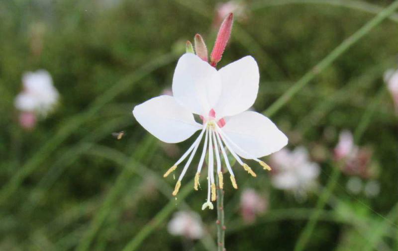●白い蝶が舞ってるように「ハクチョウソウ」が咲いています 「カウラ」という名前の植物だそうですが伸びた茎の先端に蝶に似た花がたくさん咲く花姿から「ハクチョウソウ」という和名が付いたそうです 大きな株一面に蝶が舞うように咲いている様子は風情があり庭を彩っています 一つ一つの花は短命ですが初夏から秋にかけて次々と花を咲かせ長期間楽しめる花です