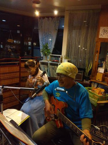 川西町役場向かいの美容室”ブルーム”でやってる新月ライブ・・今日が新月ですが都合で昨日9月22日に開催、基本は毎月、新月の日に開催されるライブです。9月は22日だそう・・チャリティー募金500円で入場可能で歌うもよし、聴くだけもよし、持ち込みありの飲食自由です、オーナースタートで順番に数曲ずつ歌っていく、夜7時開始で2時間ほど、予約もする必要はなく、気軽に参加できる・・昨日は私と山友姫とS氏と兄の4人だけ今年、秋の地区文化祭でコンサート予定でその練習兼ねての参加・・
