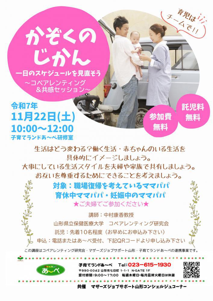 一日のスケジュールを 見直そう!!〜コペアレンティング 共感セッション〜生活はどう変わる?働く生活・赤ちゃんのいる生活を具体的にイメージしましょう。大事にしている生活スタイルを夫婦や家族で共有しましょう。お互いに尊重するためにできることを考えましょう。【日時】 11月22日(土) 10:00〜12:00 【会場】 子育てランドあ〜べ 研修室【対象】 職場復帰を考えているママパパ 育休中のママパパ・ 妊娠中のママパパ★夫婦でご参加下さい★【託児】先着10名程度 お早めにご予約ください【受講料・託児料】 無料ご興味のある方はぜひ、お気軽にお問合せください。【お問い合わせは】子育てランドあ〜べ023-615-1930受付時間9:00〜17:00毎週木曜・毎月最終火曜日は休館