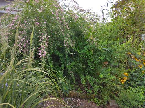 雨が降ったり止んだりで不安定な天気が続いており今朝も寒さで目が覚めました…じーじは、雨で庭仕事も思うように進みません。 萩と言えば長井の名園、“はぎ苑“がお馴染みですが我が庭の萩も大きく育って見ごろになって来ました。いろんな方向から撮ってみたのですが、じーじからは何を撮りたいのか分からないなんて、厳しい言葉… 思いつきで撮ってしまうので仕方がない…なんて、勝手に納得しているばーばデス。 ↓ウサギ大好きなので… ↓手前の”ユーパトリウムグリーンフェザー”伸び続けていますが”萩”と比べると大きさが一目でわかりますね。てっぺんまで撮れません!赤いポストは、おまけに入れてみました(^^) ↓グラス、“カラマグロスティスブラキトリカ”このところの涼しさで一気に穂が開き始めました。ガーデンでは4カ所に植栽しています。 ↓”ヘリオプシス”ですが…種類が多く名前がわかりませんが、花びらがちょっと変わっていて可愛らしく、白色フジバカマともバッチリです! おまけに・・・ レモンイエローのバラがとてもきれいに。大好きな色です。 寄せ植えの花も暑さから解放されて復活です。上手く撮れませんが、赤の金魚草は、真紅に近い色なんですが…