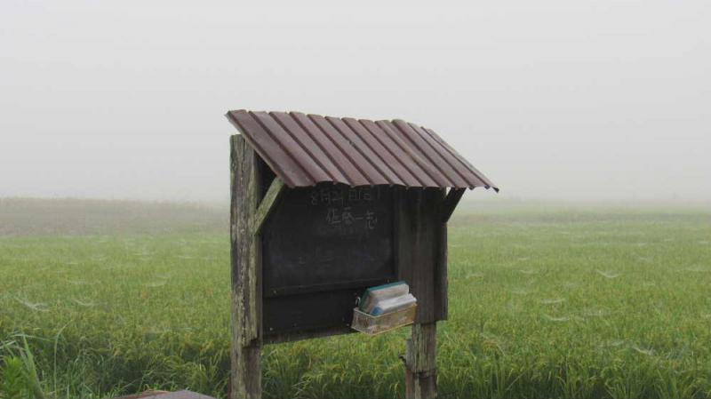 ●早朝は一面の霧に覆われるようになりました 朝晩はめっきり涼しくなりむしろ寒さを感じさせ暑さの夏からようやく解放されてきました ポツンと田んぼの川べりに立つ掲示板も心なしか寂しげです 間もなく刈り取りが始まる稲にかかるクモの巣が霧に濡れてきれいです 所々で秋を感じるようになりました