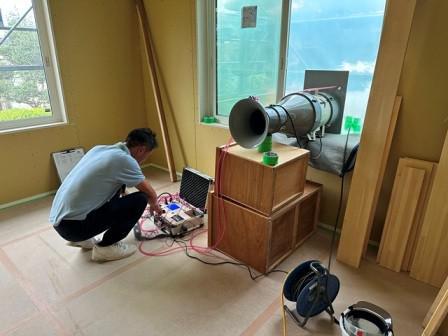 こんにちは。 新築工事が順調に進み、木工事監査を実施しました。弊社では、木工事が完了した時点で気密検査を実施しております。弊社基準値をクリアして、次工程へ進みます。 完成まで安全第一で工事を進めてまいります。 by-j.saito
