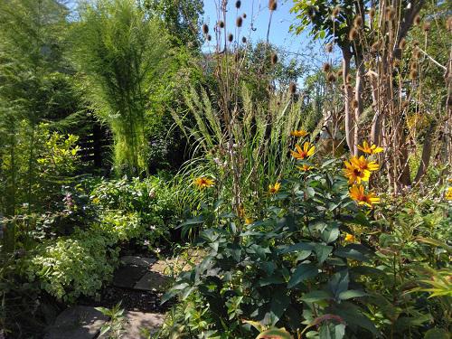 急に朝晩の冷え込みが…急激な寒暖差が、体に応えます。テレビから聞こえてきましたが夏バテから、秋バテ!ここ3年前頃から”秋バテ”なんて言葉が出てきたようです。  ここ長井の19日の朝は、14.9℃!前日よりも7℃も低く、暖房オンにしたかったくらいですが、じーじは半袖短パンの格好、この体感の違いはなあに?去年は9/22に初めて暖房オン、早かった…いつものお天気おばさんの話が長くなってしまいました。  さて、庭はグラスですっかり秋!19日の朝は寒かったですが、朝の日差しでグラスのキラキラ感が凄くて庭グル〜と、撮りまくってしまいました。 トップ写真も秋らしく、自然の風景が撮れました。  ↓我が庭で一番の見応えのある代表選手!”ペニセタム グリーンスパイク”チカラシバの一種でコボレダネで繁殖するので余計な分は抜くようにしています。     ↓ウイスキー樽鉢でおなじみのグラス”ペニセタム モードリー”  ↓“ペニセタム カーリーローズ” ↓“スティバ エンジェルヘアー”  ↓”カラマグロスティス ブラキトリカ”  おまけに。。。 切り戻しながら、まだ頑張っています。  ↓今の時期、一番きれいな色を見せてくれる”ハツユキカズラ”ミニガーデンに色を添えてくれています。    秋の庭、ガーデンマムが開いてこないと色が少しさみしいですね。もう少しの辛抱です。(^^)
