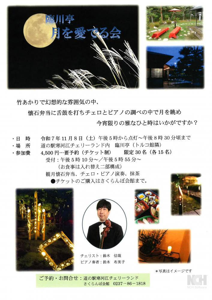 臨川亭 月を愛でる会竹あかりと美しい調べに包まれる、今宵限りの雅なひととき秋が深まる2025年11月8日(土)、道の駅寒河江チェリーランドに佇む本格的な茶室「臨川亭」にて、一夜限りの特別な催し「月を愛でる会」が開催されます。幻想的に揺れる竹あかりの中、この日のために用意された観月懐石弁当に舌鼓を打ち、チェロとピアノが奏でる美しい音色に耳を傾けながら月を眺める…。そんな贅沢で優雅な時間を過ごしてみませんか?限定30名様のみの特別なご案内です。お早めのご予約をおすすめします。 イベント概要 開催日時令和7年11月8日(土)午後5時00分〜午後8時30分頃※お食事は二部制です・一部受付:午後5時10分〜・二部受付:午後5時55分〜 場所道の駅寒河江チェリーランド内 臨川亭(トルコ館隣)Googleマップで見る 参加費4,500円(税込)※要予約・チケット制 定員限定30名(各部15名) ご予約・お問い合わせ道の駅寒河江チェリーランド さくらんぼ会館電話: 0237-86-1818 五感で味わう秋の夜長 観月懐石弁当と抹茶で味わう秋この日のために特別に作られた「観月懐石弁当」をご用意。目にも美しい料理の数々が、秋の夜を彩ります。食後には、心安らぐ抹茶のおもてなしもございます。 チェロとピアノの生演奏月の光と竹あかりが照らす幻想的な空間に、チェロとピアノの美しい調べが響き渡ります。心に染み入る音色が、非日常のひとときを演出します。 出演アーティストチェリスト:鈴木 信哉武蔵野音楽大学大学院音楽研究科修了。1999年から2003年まで山形交響楽団に在籍した経験を持つ実力派。フリーのチェリストとして全国で多様な活動を展開しています。ピアノ奏者:鈴木 布美子豊かな表現力と繊細なタッチで、聴く人を魅了するピアニスト。チェロの音色と織りなす美しいハーモニーにご期待ください。 よくあるご質問 (FAQ)予約は必要ですか?はい、完全予約制です。参加ご希望の方は、さくらんぼ会館(0237-86-1818)にてチケットをお買い求めください。定員になり次第、受付を終了いたします。駐車場はありますか?はい、道の駅寒河江チェリーランドの広大な無料駐車場をご利用いただけます。雨が降った場合はどうなりますか?会場は屋内施設の「臨川亭」ですので、雨天の場合でも開催いたします。安心してお越しください。