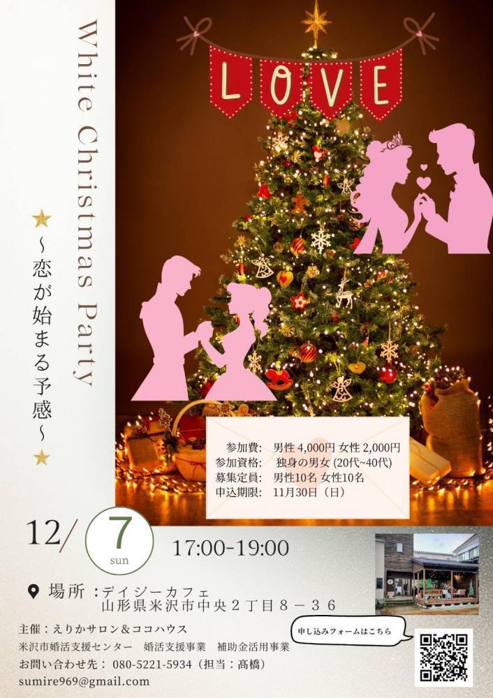 婚活イベント、ホワイトクリスマスパーティーが開催されます。日時:2025年12月7日(日曜日)17:00〜19:00場所:デイジーカフェ(米沢市中央2-8-36)参加対象 独身の男女(20代〜40代)募集定員 男性:10名 女性:10名申込み期限 11月30日(日曜日)参加費 男性:4,000円 女性:2,000円問い合わせ先 主催:えりかサロン&ココハウス(担当:高橋)電話番号:080-5221-5934Mail sumire969@gmail.com ぜひ、参加してみてください〜