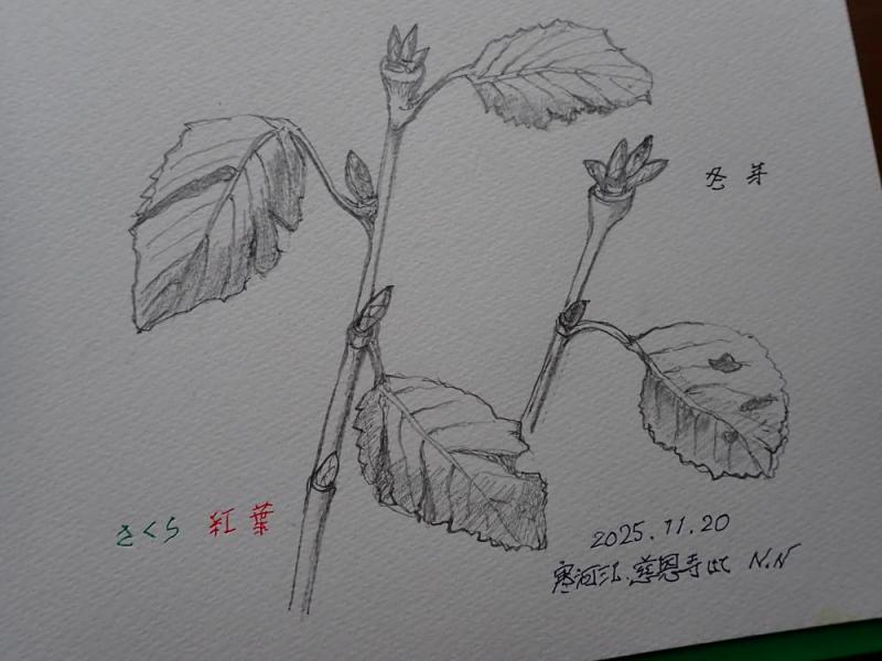 ソメイヨシノ? 墓里山の風景の観察です。頂芽のほころびです。