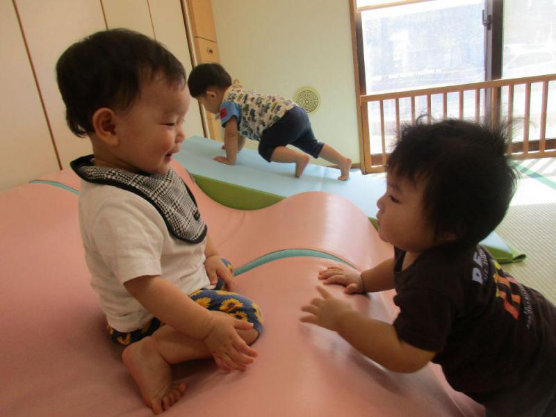 0〜2歳児さんもおままごとや外遊びでお友だちとのやりとりを楽しんだり、同じ空間で一緒に遊ぶことを楽しんでいます。車遊びを楽しんでいた2歳児さん、お友だちとベンチを利用して坂を作り車を走らせたり、仲良く座って上手にストローを吹いてシャボン玉とばしも楽しんでいます。