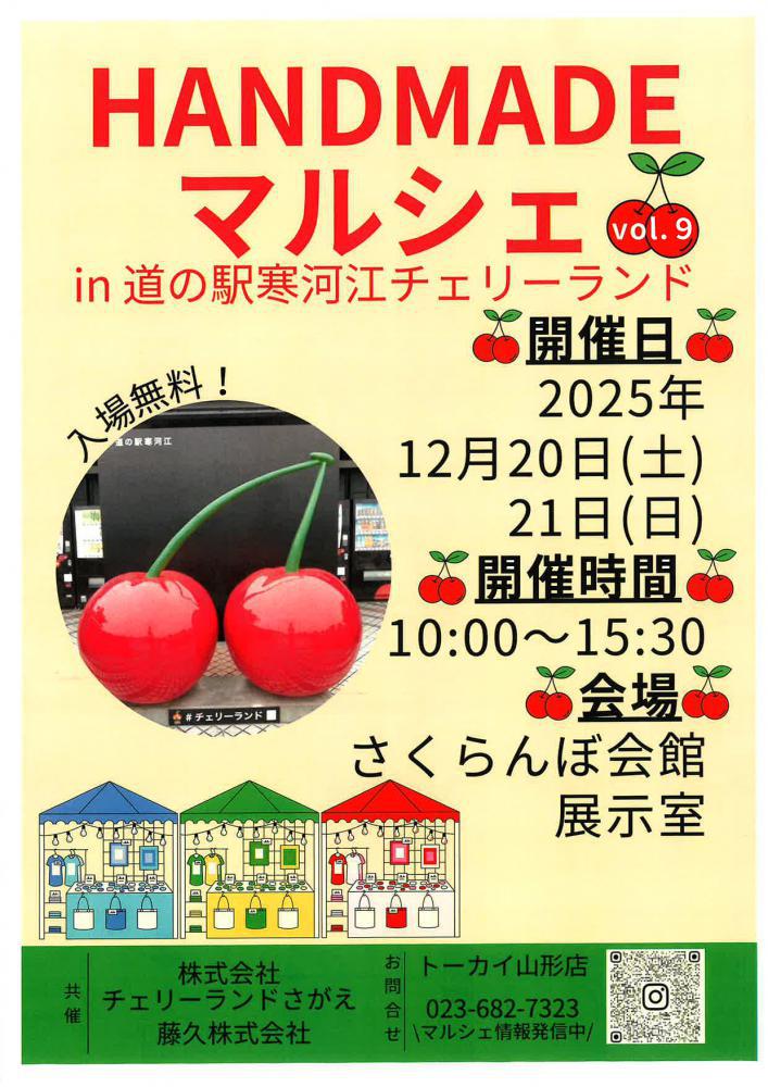 .aikiji_honbun h3 { background-color: #e60012; /* チェリーレッド */ color: #fff; padding: 15px; border-radius: 8px; font-size: 1.3em; margin-top: 40px; margin-bottom: 20px; box-shadow: 0 4px 6px rgba(0,0,0,0.1); } .aikiji_honbun h4 { border-left: 5px solid #e60012; padding-left: 15px; font-size: 1.1em; margin-top: 30px; margin-bottom: 15px; background-color: #fff5f5; padding-top: 5px; padding-bottom: 5px; } .aikiji_honbun p { margin-bottom: 20px; text-align: justify; } .event-info-box { border: 2px solid #e60012; border-radius: 10px; padding: 20px; background-color: #fffaf0; margin: 30px 0; } .event-info-item { display: flex; margin-bottom: 12px; border-bottom: 1px dotted #ccc; padding-bottom: 12px; } .event-info-item:last-child { border-bottom: none; margin-bottom: 0; padding-bottom: 0; } .event-info-label { width: 30%; font-weight: bold; color: #e60012; display: flex; align-items: center; } .event-info-value { width: 70%; } .recommend-box { background-color: #fffae6; border: 2px dashed #f39c12; padding: 20px; border-radius: 15px; margin: 40px 0; position: relative; } .recommend-title { position: absolute; top: -15px; left: 20px; background-color: #f39c12; color: #fff; padding: 5px 15px; border-radius: 20px; font-weight: bold; } .btn-link { display: inline-block; background-color: #e60012; color: #fff !important; padding: 12px 25px; border-radius: 30px; text-decoration: none; font-weight: bold; transition: opacity 0.3s; text-align: center; margin: 20px 0; box-shadow: 0 4px 6px rgba(0,0,0,0.2); } .btn-link:hover { opacity: 0.8; } /* アコーディオン */ .accordion-item { border: 1px solid #ddd; border-radius: 5px; margin-bottom: 10px; overflow: hidden; } .accordion-header { background-color: #f9f9f9; padding: 15px; cursor: pointer; font-weight: bold; display: flex; justify-content: space-between; align-items: center; } .accordion-content { padding: 15px; background-color: #fff; display: block; /* デフォルトで開く */ } /* レスポンシブ */ @media (max-width: 600px) { .event-info-item { flex-direction: column; } .event-info-label { width: 100%; margin-bottom: 5px; } .event-info-value { width: 100%; } }クリスマス直前!寒河江で心温まるハンドメイド体験を。山形県内でも屈指の人気を誇る道の駅「寒河江チェリーランド」にて、恒例の人気イベント「HANDMADEマルシェ(ハンドメイドマルシェ)」の第9回目が開催されます!開催日は2025年12月20日(土)・21日(日)の2日間。今回は屋内会場である「さくらんぼ会館」での開催となるため、雪や寒さの心配なく、ゆっくりとお買い物を楽しめます。クリスマス直前の週末、大切な人へのプレゼントや、自分へのご褒美を探しに出かけませんか?HANDMADEマルシェin 道の駅寒河江チェリーランドVol.9 開催日2025年12月20日(土)・21日(日) 開催時間10:00 〜 15:30 会場さくらんぼ会館 展示室(道の駅寒河江チェリーランド内) Googleマップで見る 入場料無料 共催株式会社チェリーランドさがえ藤久株式会社 (クラフトハートトーカイ) お問い合わせ023-682-7323(トーカイ山形店) 編集部のおすすめポイント? クリスマスギフトにぴったり!作家さんの想いが込められたハンドメイド作品は、世界に一つだけの特別な贈り物。大切な人へのプレゼントはもちろん、一年頑張った自分へのご褒美にも最適です。?? 寒い冬でも安心の屋内開催会場は暖房完備の「さくらんぼ会館 展示室」。天候を気にせず、小さなお子様連れでもゆっくりとマルシェを楽しめるのが嬉しいポイントです。?? 手芸専門店ならではのクオリティ手芸専門店「クラフトハートトーカイ」を運営する藤久株式会社が共催しているため、作品やワークショップのクオリティには定評があります! イベントの見どころ多彩なハンドメイドブースが大集合アクセサリー、布小物、バッグ、インテリア雑貨など、個性豊かなハンドメイド作家さんが集結します。量産品にはない温かみのある作品の中から、あなただけのお気に入りを見つけてください。チラシのイラストにあるように、可愛らしいサクランボモチーフのアイテムや、実用的なトートバッグなど、幅広いジャンルの作品が期待できます。ワークショップで手作り体験「見る」だけでなく「作る」楽しさも体験できるのがHANDMADEマルシェの魅力。初心者の方やお子様でも気軽に参加できるワークショップも開催予定です。冬休みの思い出作りに、親子でチャレンジしてみるのもおすすめです。道の駅グルメも満喫会場の「チェリーランドさがえ」は、山形県内でも最大級の道の駅。マルシェを楽しんだ後は、名物の手作りジェラートを味わったり、お土産コーナーで山形の美味しいものを探したりと、一日中楽しむことができます。 会場アクセス・駐車場会場となる「さくらんぼ会館」は、道の駅寒河江チェリーランドの敷地内にあります。山形自動車道 寒河江ICから車で約15分とアクセスも良好です。 駐車場について道の駅寒河江チェリーランドの広大な無料駐車場をご利用いただけます。駐車台数:約1,000台(大型車も可) よくある質問 (FAQ)Q. 入場料はかかりますか?  A. 入場は無料です。どなたでもお気軽にご来場ください。ワークショップへの参加や物販の購入には別途費用がかかります。Q. 雨や雪が降っても開催されますか?  A. はい。会場は屋内の「さくらんぼ会館 展示室」ですので、天候に関わらず