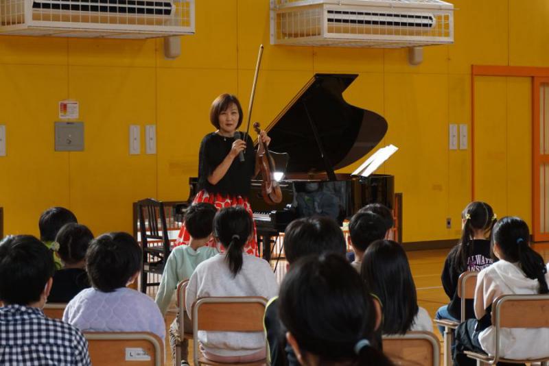 今日の4時間目に、ヴァイオリニストの相川麻里子さんをお迎えしてのアウトリーチコンサートが本校の体育館で行われました。保護者や地域の皆さんにもご案内をして、すてきな時間を楽しみました。昨日は長井市民文化会館でコンサートを行われたそうです。その際も出演した本校の4年生と6年生の兄妹の2人が、今日もピアノ演奏で共演しました。そして、相川さんの東京のヴァイオリン教室に通っている年中組のお子さんの演奏も。皆さん、すばらしい演奏でした。演奏いただいた楽曲は9曲。その中には、なんと「花笠音頭」も。個人的には、6年生のRさんが奏でるピアノとヴァイオリンの調和が印象的な「戦場のメリークリスマス」が心に響きました。相川さんからは、子どもたちの鑑賞態度が立派だったとお褒めのお言葉をいただきました。感想発表の3人(3・4・5年生)、そしてお礼の言葉と花束贈呈をした6年生も自分の言葉でしっかりと話すことができました。すてきな機会を提供いただきましたことに深く感謝申し上げます。