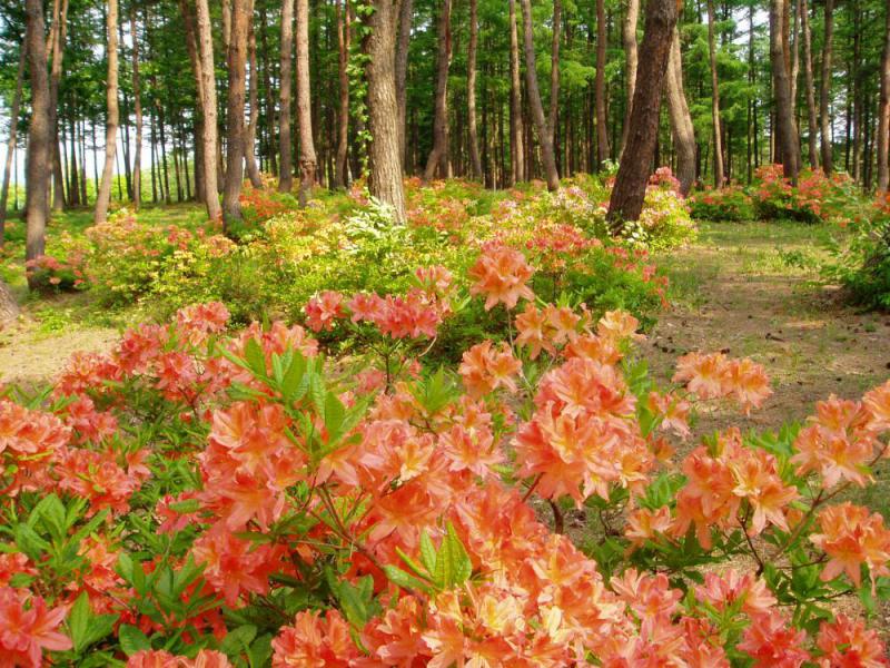 徳良湖に松林には尾花沢市の花「つつじ」がオレンジ色に花を咲かせ間もなく満開となります銀山温泉に行く手前です ちょっと車を止めて眺めてみてください尾花沢市は日本でたった2つ「花」の字が付く市ですこれから街中様々な花々で皆様のお越しお待ちいたしております