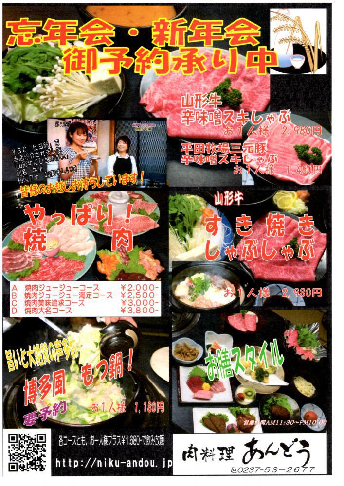 肉料理あんどうでは ただいま「忘新年会」ご予約賜り中すき焼・しゃぶしゃぶ・スキしゃぶ・もつ鍋等の温か鍋でお膳スタイルの一人一人のお料理でオードブル等の囲み料理でスタミナ盛々の焼肉コースで、又はヘルシー焼肉コースで素敵な仲間と楽しい語らいの時をお過ごしください皆様のお越しお待ちしていますm(__)m