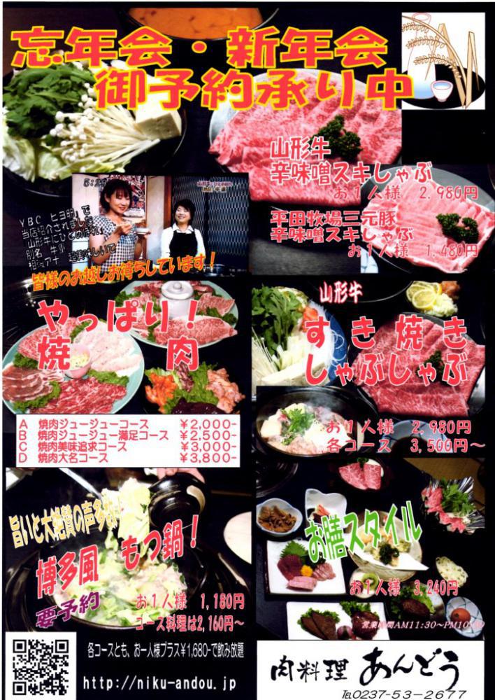 肉料理あんどう「忘年会・新年会ご予約賜り中」師走に入り、雪も降ってきて、年の瀬を実感する、今日この頃ですね只今、肉料理あんどうでは、ご予算・お好みに合わせた「忘年会・新年会」のいろんな企画をご用意して、皆様のお越しをお待ちしています。お電話・メール等で、お問い合わせください。素敵な仲間と、美味しい・旨い「山形牛」を食べて、お酒を飲めば至福の時、間違いなし、みんな笑顔になります(*^・^*)皆様のお越しお待ちしていますm(__)m