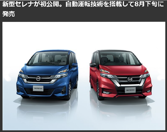 いよいよ新型セレナが出ます。自動運転を付けて!スタイルもノア・ボクシーなんかより断然いいですねぇ。でも、自動運転と言っても、高速道路の白線内だけなので、各社がすでに搭載しているもののような気がします。但し、このクラスに搭載というのは、画期的な事なのかな?ハンドルから手を放すと警報も鳴るみたいだし。あとは、ストロングハイブリッドがいつ販売されるかですね。ノートのストロングハイブリッドも気になります。もうそろそろなのですが。追伸 「渋滞時のステアリング・アクセル・ブレーキすべての自動化」と「全車速域でのステアリング制御」は日本メーカーとしては初採用になるそうです。