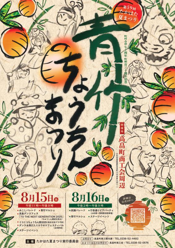 300年以上の歴史を持つこの祭りは、安久津八幡神社の御神輿が、年に一度の縁日に高畠巌島神社に一夜泊まる際に、道沿いの家々が青竹にちょうちんを灯して御神輿を迎えたことが始まりと言われています。現在では、高畠地区商店街で各戸が1〜2本の青竹ちょうちんを飾り、その中を夕方から夜にかけて、15日は神輿パレード、16日は民謡パレードを行います。共催イベントも盛りだくさんです!高畠の熱い夏をお楽しみください(青竹ちょうちんまつり 由来はこちら)<開催日>令和7年8月15日(金曜日) 午前11時から午後9時まで令和7年8月16日(土曜日) 午後 2時から午後9時まで JR高畠駅と会場をつなぐ無料のシャトルバスが両日ともに運行します。駅から15分で会場までお送りいたしますので、ぜひご活用ください。 ※時刻表は、随時更新させていただきます。※時刻表の時間はあくまで予定です。交通状況等により、遅延する場合がございます。※満席の際には、ご乗車できない場合がございますので、ご了承ください。※この時間以外に、駅または会場に向かう際には、タクシーをご利用ください。 高畠町多目的広場高畠町中央公園 駐車場JA山形おきたま たかはた支店 駐車場高畠町文化ホール・まほら 駐車場▼詳細は以下のQRコード、もしくはURLからもご確認いただけます。https://www.google.com/maps/d/viewer?mid=1DHQKDEuvvvVNL-vktK6nOsSgyMAJdDo&usp=sharing 15日イベント〇みこしパレード 【場所】高畠町商工会前スタート・ゴール【時間】祈願祭   18:15〜 予定    スタート  18:30〜 予定【参加団体】 高畠町商工会青年部(三重塔みこし) 高畠町建設組合青年部(六方みこし) 華神輿組(華神輿) 高畠町役場(龍みこし) 〇高畠ダンスフェス「TO THE NEXT GENERATION 2025」【場所】ちゅうしん蔵前交差点【時間】11:00〜16:40   [1stステージ]  11:00〜14:00   [DJ出演]    14:00〜14:30   [2ndステージ] 14:30〜16:40【出演グループ】 The Groovy 75 ドラゴンティアーズ絆 X1 BEAT FACTORY EVE Fam ties オニッコ ジャンヌダルク【出演DJ】 Mountain Killa高畠町のグループを中心とした山形県の多彩なダンスグループが、ジャンルや世代を超えて大集合!迫力のステージ、心に響く表現、思わず体が動き出すようなリズムの数々。ダンスが好きな方はもちろん、「あまり見たことがない」という方も、きっと心が動くはず。この日限りの感動を、青竹ちょうちん祭りで一緒に体感しませんか?世代を越えて受け継がれるダンスの魅力。子どもから大人まで、未来へ羽ばたくエネルギーあふれる高畠ダンスフェスをお楽しみください。※出演グループ・タイムスケジュールは、随時更新させていただきます。〇ダンス&飛び入りカラオケフェスティバル【場所】永和軒前【時間】18:00〜21:00【パフォーマー】The Groovy 75        Mountain Killa (DJ) 司会:加藤マチャアキ 歌とダンスで青竹ちょうちんまつりを一緒に盛り上げましょう!〇ミコミコちょうちん祭2025【場所】高畠町総合交流プラザ周辺【日程】10:00〜16:00キッチンカーやミニ縁日など、お楽しみが目白押し!アニメグッズ中心のフリーマーケットの「ミコいち」や、県内外の痛車が集結する「痛車コーナー」で、アニメが好きな人にはもってこいのイベントです。高畠町総合交流プラザ内の多目的スペースでは タカラトミー公式ベイブレード大会を開催します!【大会名】S1:羽前杯プチinミコちょうコラボカップ (全対戦 3ON3バトルのトーナメント)【定 員】24名  ※TwiPlaからのエントリー ※当日受付あり【持ち物】ベイブレード(最低3組)、ランチャー、3ON3デッキケース▼詳細は以下のQRコード、もしくはURLからご確認いただけます https://sites.google.com/view/oremaka-takahata/host_event/mikocho 主催:おれまか〇ゆるキャラ登場【場所】商工会本部周辺【時間】17:00〜18:30(神事に合わせて)高畠町公式キャラクター「たかっき・はたっき」と、山形県のマスコットキャラクター「きてけろくん」が登場!16日イベント〇民謡パレード【場所】 スタート 幼児の部…おばこや前  一般の部…厳島神社前 ゴール  幼児の部、一般の部前半…高畠町総合交流プラザ前      一般の部後半…永和軒前 【日程】17:30 幼児の部から順次スタート予定高畠花笠音頭を美しく、可愛らしく、元気よく各団体ごとの個性ある踊りをお楽しみください。 〇庁舎通りビアパーティー【場所】山形第一信用組合南側駐車場 庁舎通り商店街が主催する「ビアパーティー」 ビールやグルメの販売があり、まつりとお酒を楽しめます!両日開催イベント〇青竹マルシェ 【場所・日時】15日(11:00〜21:00) まほろば通り(高畠町総合交流プラザ前)        16日(14:00〜21:00) 商工会前駐車場 町内外からたくさんのハンドメイド雑貨・アクセサリーやキッチンカーが出店いたします。ぜひ足をお運びください!〇ステージイベント〈15日〉【場所】商工会前駐車場    【時間】14:50〜21:00(みこしパレード中は休止)〈16日〉【場所】山形銀行高畠支店 駐車場    【時間】14:00〜17:00 バンド演奏やダンスの披露など日中から楽しめるステージイベントを開催! 主催:自由
