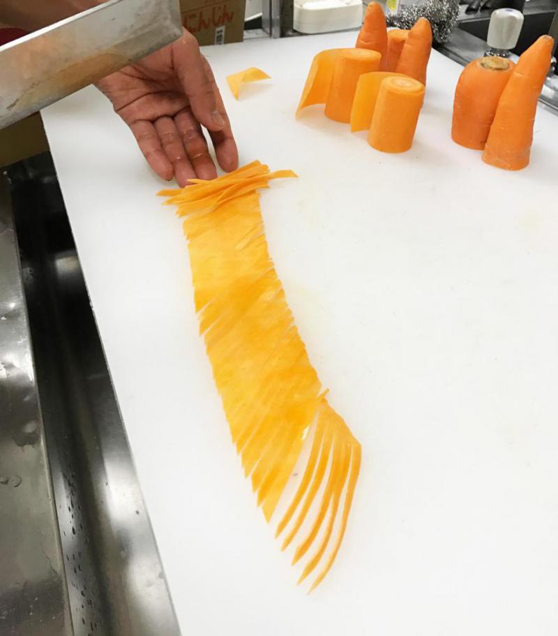 調理場でのワンシーン。あしらいのひとつひとつにも「ひと手間」をかけております。さて問題です。このにんじんは、一体何に使うのでしょうか!? 正解はこの料理写真の中にあります!見つけましたか?「より人参」!!お造りに飾る”飾り切り”のにんじんです★ 美味求真の宿 天童ホテルhttp://www.tendohotel.co.jp