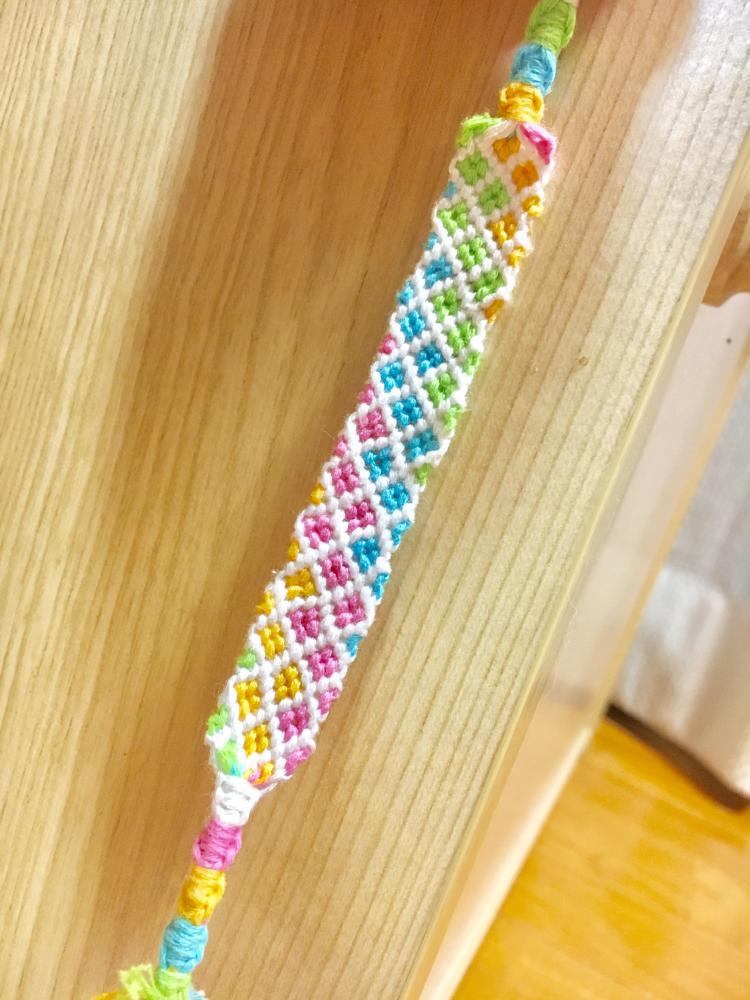 ミサンガづくりに再熱し、昔作ったときに撮った写真を探しにスマホのフォルダをスワイプスワイプ・・・いろんな作品を見てるうちに使った色の意味が気になってしまいGoogle先生に聞きました。そしたら、 赤・・・情熱、運動、勇気、恋愛運白・・・健康、爽やかさ、落ち着き、効率ピンク・・・恋愛運、強調、モテる、可愛くなる、調和オレンジ・・・希望、友情、力強さ、笑顔黄色・・・金運、知識、学問、向上、笑顔、明るさ、平和緑・・・癒し、やさしさ、和み、金運黄緑・・・友情、やさしさ青・・・仕事、爽やかさ、行動、学問、心を癒す水色・・・美しさ、爽やかさ、笑顔灰色・・・仕事運黒・・・好意、意思で、なんか見てるのが面白くなりました。私は基本的にミサンガを誰かに作るときは色も選んでもらうのですが、みなさん無意識に自分に必要な色を選んでいるみたいでしたw無意識ってすごいですね。。。