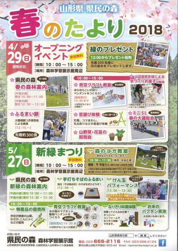 冬期閉鎖していた県民の森がいよいよオープンします!4月29日はオープニングイベントが開催されます。ゴールデンウィークは、春の訪れを感じる県民の森に遊びにいきましょう(^o^)/ ▼オープニングイベント □日 時 2018年4月29日(日・昭和の日) □時 間 10:00〜15:00 □場 所 森林学習展示館周辺 □イベント内容 ・緑のプレゼント(先着200名様) ・春の森林案内 ・ふるまい餅 ・青空クラフト教室 ・昔遊び体験 ・山野草・花苗の即売会 ・山辺高校生生徒による手づくりお菓子の販売 ・ミニSL春の大運転会□お問合せ先 県民の森 電話:023-666-2116 また、5月27日(日)は、「新緑まつり」が開催されます。こちらも楽しいイベントが盛りだくさんです。その他、県民の森では様々な行事が行われています。四季折々の季節を感じられる県民の森に遊びに来ませんか!!