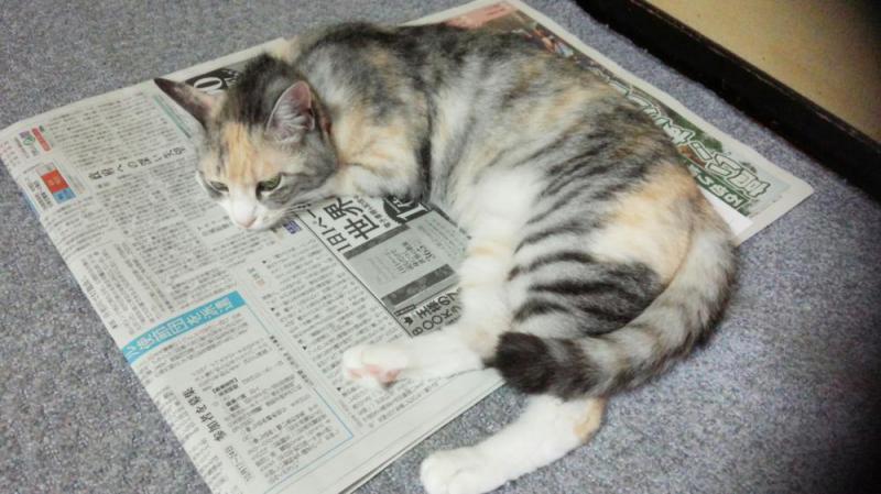 新聞の上は、すこしヒンヤリするのかな。のびーっと寝てしまいました。