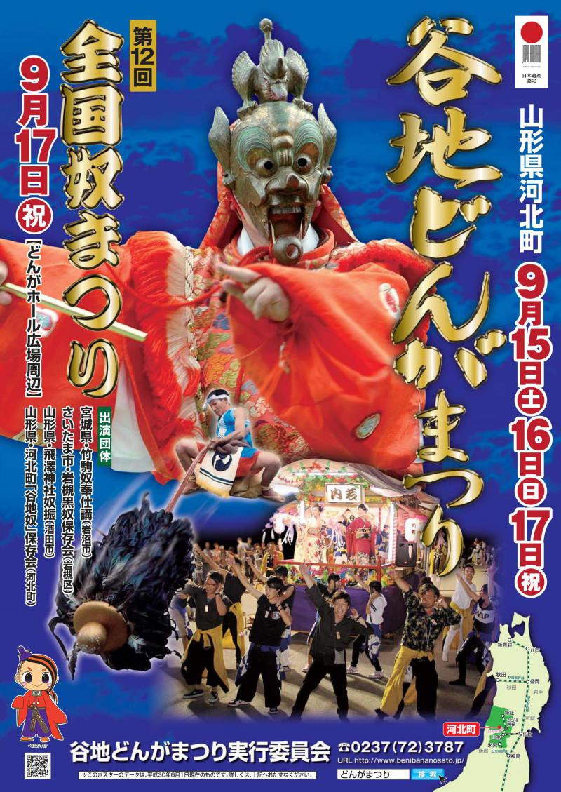 2018年の谷地どんがまつりは、第12回全国奴まつりとともに、9月15日(土)16日(日)17日(祝)開催です! 例年通りのまつりのみどころに加え、今年は新たなこころみとしてリアル謎解きゲーム【べにのすけと不思議な手紙】というイベントも開催します。厳かな林家舞楽とあでやかな囃子屋台、さらに、力強い奴振りの静と動が織りなす谷地どんがまつりに、ぜひ、いらしてください。 ◇まつりのみどころ◇15日・谷地八幡宮境内での林家舞楽紅染めの衣装やかがり火が灯る夜の清浄な闇の中で厳かに行われる夜遊の舞です。(会場、谷地八幡宮)16日・御神輿還御の行列、谷地奴奴の勇壮な振り姿とユニークな掛け歌は楽しさ満載です。さらに、谷地八幡宮の鳥居をくぐる瞬間は必見です。(会場、谷地八幡宮)17日・全国奴まつり、囃子屋台の競演4団体の個性豊かな奴が出演します。また、町内一円を3日間練り歩いた囃子屋台がどんがホールにて一堂に会してのお囃子と歌踊りは圧巻です。(会場、どんがホール広場周辺) お問い合わせ先山形県河北町商工観光課:0237-73-5162(一社)河北町観光協会:0237-72-3787谷地八幡宮:0237-72-2149 かほくべに花おとめのインターネットラジオ「やっしょまかしょ かほくべに花おとめの聞いてけろ来てけろラジオ」にて、どんがまつりについて谷地八幡宮神主・林重紘さんよりお話ししていただきました。