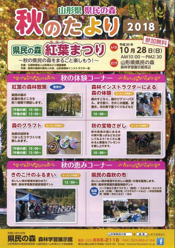 県民の森より秋のたよりが届きました♪10月28日(日)は県民の森「紅葉まつり」を開催します。紅葉が見頃となった県民の森で様々な体験イベントが行われます。秋の県民の森をまるごと楽しみましょう!また、県民の森では、季節ごと様々な行事も開催しています。身近に自然を感じられる県民の森に遊びにきませんか!(^^)! 県民の森「紅葉まつり」□日 時 平成30年10月28日(日)□時 間 AM10:00〜PM2:30□場 所 県民の森森林学習展示館周辺□イベント内容 ・紅葉の森林散策 ・森のクラフト ・森林インストラクターによる森の体験 ・秋の宝物さがし ・きのこ汁のふるまい ・県民の森秋の市□お問合せ先 県民の森学習展示館 TEL:023-666-2116 FAX:023-666-2124