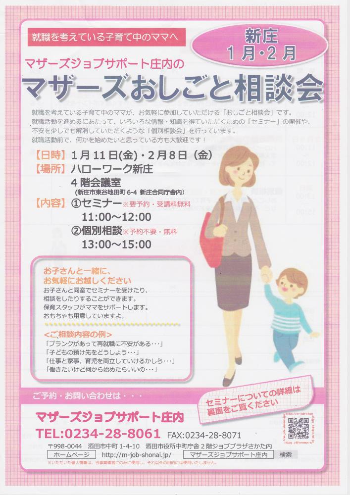 雪の便りが近づいてきました。体調管理にはお気を付けくださいね。 ハローワーク新庄『おしごと相談会』を開催します。 【日時と内容】■ 1月11日(金) 11:00〜12:00 セミナー ※お申込みが必要です。 「面接に向けて自分のことを話してみよう!」 将来の面接に向けて、自己PRできることなど、 わかりやすく話すポイントを知り、面接への準備を始めませんか? 13:00〜15:00 個別相談会 ※どなたでもご利用いただけます、お申込みは不要です。 直接『4階 会議室』へお越しください♪ ・おしごとに関するお悩み ・子育てに関すること ・仕事と家事、子育てとの両立 など、お気軽にご相談ください。 ■ 2月8日(金) 11:00〜12:00 セミナー ※お申込みが必要です。 「就職活動の基本とポイントを知ろう!」 ハローワークの職員を講師に招いてのセミナーです。 求人票を見る時のポイントや書類の書き方、面接の 受け方など、具体的な話を聞いて、仕事復帰の ヒントを一緒に見つけてみませんか? 13:00〜15:00 個別相談会 ※どなたでもご利用いただけます、お申込みは不要です。 直接『4階 会議室』へお越しください♪ ・おしごとに関するお悩み ・子育てに関すること ・仕事と家事、子育てとの両立 など、お気軽にご相談ください。 お子さんと一緒に、お気軽にお越しください。お子さんと同じお部屋でセミナーを受講し、相談することができます。保育スタッフが、お子さんを見守りいたします。 ◇お申込み・お問い合わせ◇ マザーズジョブサポート庄内 TEL:0234-28-8061
