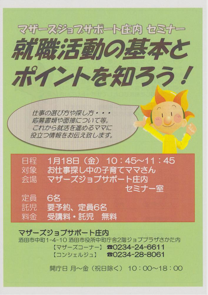 1月『マザーズジョブサポート庄内 求職支援セミナー』『就職活動の基本とポイントを知ろう!』を行います! 就職活動を始めるための基本とポイントを学んでみませんか? ★仕事の選び方や探し方★応募書類や面接について など 就活を進めるママに役立つ情報をお伝えします。 ハローワークマザーズコーナーでは定期的にセミナーを開催します。奮ってご参加下さい。受講後も疑問点など、窓口にてご相談が受けられます。☆雇用保険受給者の方は求職活動実績にカウント出来ます☆ 【日 時】1月18日(金) 10時45分〜11時45分【対 象】お仕事探し中の子育てママさん【会 場】マザーズジョブサポート庄内 セミナールーム【料 金】受講料 及び 託児料 無料【定 員】先着6名 ※お申込みが必要です。【託 児】定員6名 ※事前登録・予約が必要です。 ※併設の保育ルームで、保育スタッフがお子さんを お預かりします。ママは安心して受講いただけます。 【駐車場について】 お車でお越しの際は、中町庁舎脇にある 〈セントラルホテル契約駐車場〉をご利用ください。 (ジョブプラザさかたと表示してあります。) ※契約駐車場が満車の場合は、 酒田市中央地下駐車場をご利用ください。 地下駐車場をご利用の方は、無料駐車券を発行いたします。 お帰りの際に、マザーズ窓口へお声がけください。 どうぞ、お気軽にお問い合わせくださいね。 ◇お申込み・お問い合わせ◇マザーズジョブサポート庄内TEL:0234-24-6611(マザーズコーナー)TEL:0234-28-8061(コンシェルジュコーナー)開庁日 月〜金(祝日除く)10:00〜18:00
