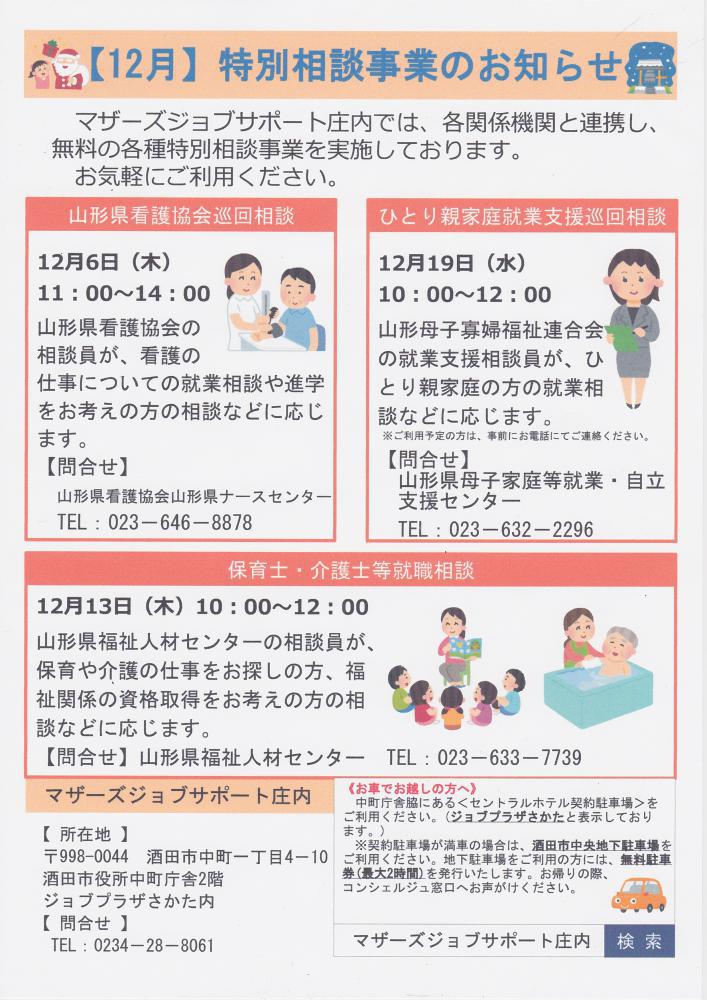 マザーズジョブサポート庄内では、各関係機関と連携し、各種特別相談事業を実施しております。ぜひ、ご利用ください。  山形県看護協会巡回相談 ※お申し込み不要  日時  12月6日(木)11:00〜14:00  場所  マザーズジョブサポート庄内 セミナールーム  問合せ 山形県看護協会 пF023-646-8878       HP:http://www.nurse-yamagata.or.jp/       看護の仕事への復職をお考えの方、お気軽にご相談ください   保育士・介護士等就職相談 ※お申し込み不要  日時  12月13日(木)10:00〜12:00  場所  マザーズジョブサポート庄内 セミナールーム   問合せ 山形県福祉人材センター пF023-633-7739       HP:http://www.ymgt-shakyo.or.jp/jinzai/                 保育士・介護士・看護師など資格をお持ちの方や、          資格取得を目指している方、福祉職にご関心のある方は          お気軽にお越しください。  ひとり親家庭就業支援相談 [要予約]  日時  12月19日(水)10:00〜12:00  場所  マザーズジョブサポート庄内 セミナールーム  問合せ 山形県母子家庭等就業・自立支援センター пF023-632-2296       HP:http://www.y-boshi.com/self-support/                  ひとり親家庭の方や今後について考えている方、       どうぞお気軽にお越しください。      ※ご利用希望の方は、マザーズジョブサポート庄内への       ご登録が必要となります。      ※ご相談の際、お子さまの託児は『保育ルームきらきら』を       ご利用いただけます。 事前にご予約が必要です。  ※各相談会について、利用ご希望の方は、 マザーズジョブサポート庄内 マザーズ・コンシェルジュまで お気軽にお声掛けください。※ご相談の際、お子さまの託児は『保育ルーム きらきら』をご利用いただけます。 託児ルームのご利用には、事前のご登録が必要です。  【駐車場について】 お車でお越しの際は、中町庁舎脇にある 〈セントラルホテル契約駐車場〉をご利用ください。 (ジョブプラザさかたと表示してあります。) ※契約駐車場が満車の場合は、 酒田市中央地下駐車場をご利用ください。 地下駐車場をご利用の方は、無料駐車券(最大2時間)を 発行いたします。 お帰りの際に、コンシェルジュ窓口へお声がけください。 ◇お申込み・お問い合わせ◇マザーズジョブサポート庄内TEL:0234-28-8061