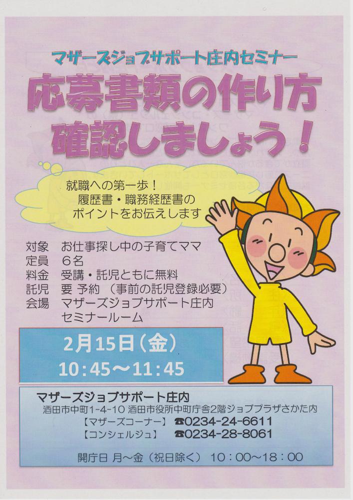 2月『マザーズジョブサポート庄内 求職支援セミナー』『応募書類の作り方確認しましょう!』を行います! このセミナーは就職への第一歩!履歴書・職務経歴書のポイントをお伝えします。 ハローワークマザーズコーナーでは定期的にセミナーを開催します。奮ってご参加下さい。受講後も疑問点など、窓口にてご相談が受けられます。☆雇用保険受給者の方は求職活動実績にカウント出来ます☆ 【日 時】2月15日(金)     10時45分〜11時45分【対 象】お仕事探し中の子育てママさん【会 場】マザーズジョブサポート庄内 セミナールーム【料 金】受講料 及び 託児料 無料【定 員】先着6名 ※お申込みが必要です。【託 児】定員6名 ※事前登録・予約が必要です。                     ※併設の保育ルームで、保育スタッフがお子さんを          お預かりします。ママは安心して受講いただけます。                 【駐車場について】    お車でお越しの際は、中町庁舎脇にある    〈セントラルホテル契約駐車場〉をご利用ください。    (ジョブプラザさかたと表示してあります。)      ※契約駐車場が満車の場合は、      酒田市中央地下駐車場をご利用ください。      地下駐車場をご利用の方は、無料駐車券を発行いたします。      お帰りの際に、マザーズ窓口へお声がけください。 どうぞ、お気軽にお問い合わせくださいね。 ◇お申込み・お問い合わせ◇マザーズジョブサポート庄内TEL:0234-24-6611(マザーズコーナー)TEL:0234-28-8061(コンシェルジュコーナー)開庁日 月〜金(祝日除く)10:00〜18:00