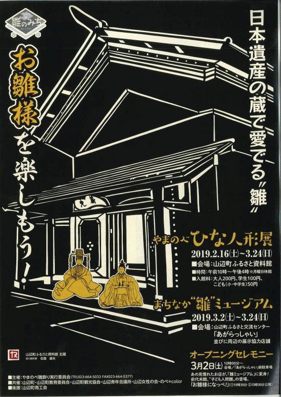 ふるさと資料館では、『やまのべひな人形展』を開催します。江戸時代より最上川舟運と紅花交易によって取り寄せられた貴重な雛人形を一堂に展示します。雛の歴史や寛永雛・元禄雛・享保雛・古今雛などそれぞれの時代雛の特徴の違いをお楽しみいただけます。 また、3月2日(土)からは『まちなか“雛”ミュージアム』が始まります。ふるさと交流センター「あがらっしゃい」を中心に、周辺の商店街には“山辺が創る、いろんなお雛様”をテーマにここだけにしかない創作お雛様を展示します。ひなまつり期間中は、ワークショップや雛コンサートの開催、またニットで作った雛衣装を着て記念撮影ができるフォトジェニックスポットを設営します。楽しいイベントが盛りだくさんの山辺町のひな祭りをお楽しみください!  【やまのべ雛人形展】   ◇開催期間    2019年2月16日(土)〜3月24日(日)   ◇開催会場    山辺町ふるさと資料館   ◇開催時間    午前10時〜午後4時    ◇入館料     大人200円、学生100円、小人50円                      ※月曜日休館      ◇お問い合わせ先               山辺町ふるさと資料館 [TEL] 023−664−5033   【まちなか“雛”ミュージアム】   ◇開催期間   2019年3月2日(土)〜3月24日(日)   ◇開催会場   ふるさと資料館・交流センター「あがらっしゃい」・町内雛人形展示協力店   ◇開催時間   各店舗営業時間内   ◇料   金   無料