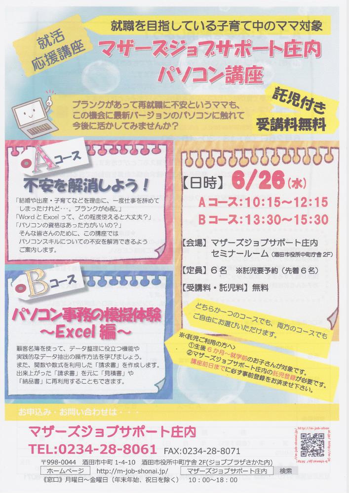 ☆マザーズジョブサポート庄内主催☆再就職応援 『パソコン講座』のお知らせ ◇Aコース◇ 6月26日(水)10:15〜12:15 『不安を解消しよう!』 「結婚や出産・子育てなどを理由に、 一度仕事をやめてしまったけれど…。ブランクが心配。」 「WordとExcelって、どの程度使えると大丈夫?」 「パソコンの資格はあったほうがいいの?」 そんな皆さんのために、この講座では パソコンスキルについての不安を解消できるようご案内します。 ◇Bコース◇ 6月26日(水)13:30〜15:30 『パソコン事務の模擬体験〜Excel編〜』 顧客名簿を使って、データ整理に役立つ機能や 実践的なデータ抽出の操作方法を学びましょう。 また、関数や数式を利用した「請求書」を作成します。 出来上がった「請求書」を元に「見積書」や「納品書」 に再利用することもできます。 ♪片方のコースのみ、両方のコース、どちらの受講でも可能です♪ ※本セミナーは「雇用保険受給中の求職活動実績」として認められます。 【対 象】就職を目指している子育て中のママ ※就職活動前で何かを始めたい方でもOK【会 場】マザーズジョブサポート庄内 セミナールーム【料 金】受講料 及び 託児料 無料【定 員】先着6名 ※お申込みが必要です。【託 児】定員6名 ※事前登録・予約が必要です。 ※併設の保育ルームで、保育スタッフがお子さんを お預かりします。ママは安心して受講いただけます。 【駐車場について】お車でお越しの際は、中町庁舎脇にある〈セントラルホテル契約駐車場〉をご利用ください。(ジョブプラザさかたと表示してあります。)※契約駐車場が満車の場合は、酒田市中央地下駐車場をご利用ください。地下駐車場をご利用の方は、無料駐車券(最大2時間)を発行いたします。お帰りの際に、コンシェルジュ窓口へお声がけください。 お気軽にお問い合わせください♪ ◇お申込み・お問い合わせ◇マザーズジョブサポート庄内TEL:0234-28-8061