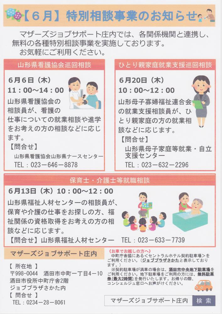 マザーズジョブサポート庄内では、各関係機関と連携し、各種特別相談事業を実施しております。ぜひ、ご利用ください。  山形県看護協会巡回相談 ※お申し込み不要  日時  6月6日(木)11:00〜14:00  場所  マザーズジョブサポート庄内 セミナールーム  問合せ 山形県看護協会 пF023-646-8878       HP:http://www.nurse-yamagata.or.jp/       看護の仕事への復職をお考えの方、お気軽にご相談ください。   保育士・介護士等就職相談 ※お申し込み不要  日時  6月13日(木)10:00〜12:00  場所  マザーズジョブサポート庄内 セミナールーム   問合せ 山形県福祉人材センター пF023-633-7739       HP:http://www.ymgt-shakyo.or.jp/jinzai/                                     保育士・介護士・看護師など資格をお持ちの方や、                     資格取得を目指している方、福祉職にご関心のある方は                     お気軽にお越しください。  ひとり親家庭就業支援相談 [要予約]  日時  6月20日(木)10:00〜12:00  場所  マザーズジョブサポート庄内 セミナールーム  問合せ 山形県母子家庭等就業・自立支援センター пF023-632-2296       HP:http://www.y-boshi.com/self-support/                                     ひとり親家庭の方や今後について考えている方、                   どうぞお気軽にお越しください。       ※ご利用希望の方は、マザーズジョブサポート庄内への       ご登録が必要となります。      ※ご相談の際、お子さまの託児は『保育ルームきらきら』を       ご利用いただけます。 事前にご予約が必要です。  ※各相談会について、利用ご希望の方は、 マザーズジョブサポート庄内 マザーズ・コンシェルジュまで お気軽にお声掛けください。※ご相談の際、お子さまの託児は『保育ルーム きらきら』をご利用いただけます。 託児ルームのご利用には、事前のご登録が必要です。  【駐車場について】 お車でお越しの際は、中町庁舎脇にある 〈セントラルホテル契約駐車場〉をご利用ください。 (ジョブプラザさかたと表示してあります。) ※契約駐車場が満車の場合は、 酒田市中央地下駐車場をご利用ください。 地下駐車場をご利用の方は、無料駐車券(最大2時間)を 発行いたします。 お帰りの際に、コンシェルジュ窓口へお声がけください。 ◇お申込み・お問い合わせ◇マザーズジョブサポート庄内TEL:0234-28-8061
