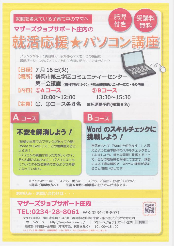 ☆マザーズジョブサポート庄内主催☆<鶴岡初開催です!> 再就職応援 『パソコン講座』のお知らせ ◇Aコース◇ 7月16日(火)10:00〜12:00 『不安を解消しよう!』 「結婚や出産・子育てなどを理由に、 一度仕事をやめてしまったけれど…。ブランクが心配。」 「WordとExcelって、どの程度使えると大丈夫?」 「パソコンの資格はあったほうがいいの?」 そんな皆さんのために、この講座では パソコンスキルについての不安を解消できるようご案内します。 ◇Bコース◇ 7月16日(火)13:30〜15:30 『Wordのスキルチェックに挑戦しよう!』 自信を持って「Word使えます!」と言えるよう、 基本操作のスキルチェックをしてみませんか? 様々な問題に挑戦することで、自分が理解しているところと そうでないところ明確にすることができます。 講師による丁寧な解説もありWordの理解が深まること 間違いなしです! ♪片方のコースのみ、両方のコース、どちらの受講でも可能です♪ ※本セミナーは「雇用保険受給中の求職活動実績」として認められます。 【対 象】就職を目指している子育て中のママ ※就職活動前で何かを始めたい方でもOK【会 場】鶴岡市第三学区コミュニティセンター 1階 第一会議室(総合保健福祉センターにこ♥ふる内) 鶴岡市泉町5-30 0235-24-2212【料 金】受講料 及び 託児料 無料【定 員】先着8名 ※お申込みが必要です。【託 児】定員8名 ※予約が必要です。 ※会場前の第一和室にて、保育スタッフがお子さんを お預かりします。ママは安心して受講いただけます。 【駐車場について】お車でお越しの際は、にこ♥ふるの駐車場をご利用ください。 酒田では毎回キャンセル待ちが出るほど人気の講座が、鶴岡で初開催となりました!お早目のご応募をお待ちしております。お気軽にお問い合わせください♪(Aコース・Bコース共に初心者向けの内容となっております。) ◇お申込み・お問い合わせ◇マザーズジョブサポート庄内TEL:0234-28-8061