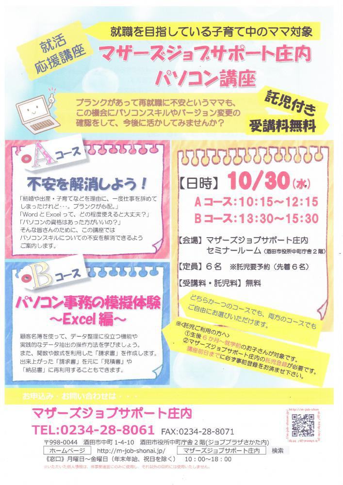 ☆マザーズジョブサポート庄内主催☆就活応援『パソコン講座』のお知らせ ◇Aコース◇  10月30日(水)10:15〜12:15『不安を解消しよう!』「求人票の"パソコンが使える方"ってどの程度?」「仕事では、どのくらいのパソコンのスキルが求められるの?」「WordとExcelって、どの程度使えると大丈夫?」などいろいろな不安がありますよね…   パソコンについての"これから"を考えるきっかけに♪   ◇Bコース◇  10月30日(水)13:30〜15:30『パソコン事務の模擬体験〜Excel編〜』顧客名簿を使って、データ整理に役立つ機能や実践的なデータ抽出の操作方法を学びましょう。また、関数や数式を利用した「請求書」を作成します。出来上がった「請求書」を元に「見積書」や「納品書」に再利用することもできます。  ♪片方のコースのみ、両方のコース、どちらの受講でも可能です♪ ※本セミナーは「雇用保険受給中の求職活動実績」として認められます。 【対 象】就職を目指している子育て中のママ ※就職活動前で何かを始めたい方でもOK【会 場】マザーズジョブサポート庄内 セミナールーム【料 金】受講料 及び 託児料 無料【定 員】先着6名 ※お申込みが必要です。【託 児】定員6名 ※事前登録・予約が必要です。※併設の保育ルームで、保育スタッフがお子さんをお預かりします。ママは安心して受講いただけます。  【駐車場について】お車でお越しの際は、中町庁舎脇にある〈セントラルホテル契約駐車場〉をご利用ください。(ジョブプラザさかたと表示してあります。)※契約駐車場が満車の場合は、酒田市中央地下駐車場をご利用ください。酒田市中央地下駐車場をご利用の方は、無料駐車券(最大2時間)を発行いたします。お帰りの際に、コンシェルジュ窓口へお声がけください。  お気軽にお問い合わせください♪ ◇お申込み・お問い合わせ◇マザーズジョブサポート庄内TEL:0234-28-8061