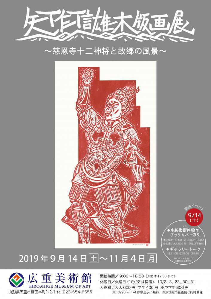 「矢作信雄木版画展 〜慈恩寺十二神将と故郷の風景〜」山形県河北町出身のイラストレーター・版画家である矢作信雄氏の木版画作品展を開催します。本山慈恩寺(寒河江市)の十二神将像をテーマに制作された12枚の大作をはじめ、日本各地の風景を描いた木版画を展示します。独自のデザイン性と色づかいの中にも、木版画ならではの温かみが感じられる作品の数々をどうぞご覧ください。会期/2019年9月14日(土)〜11月4日(月)会場/広重美術館 2階 多目的ホール時間/9:00〜18:00(入館受付は17:30まで)休館日/毎週火曜日(10/22は開館)、    および10/2、3、23、30、31入館料/大人600円 学生400円 小中学生300円     ※10/26〜11/4は学生以下無料     ※浮世絵の企画展もご覧いただけますイベント・ワークショップ/開催日 9月14日(土)◆木版画摺体験でブックカバー作り @9:00〜11:00 A13:00〜15:00 定員/各回10名  ※1人2枚制作 参加費/大人500円     学生以下無料(要予約、別途入館料が必要)◆ギャラリートーク @11:00〜 A15:00〜プロフィール/矢作 信雄イラストレーター、版画家、町田デザイン専門学校非常勤講師、日本美術家連盟会員1948年山形県河北町生まれ。25歳からフリーのイラストレーターとして活動し、27歳の時に木版画をはじめる。年鑑日本のイラストレーション、チョイスなどに入選。仕事では、?広告、出版、展示館、カレンダー、絵本、版画作品などを手がける。2009年サハトべに花「矢作信雄の仕事展」など、全国で個展やグループ展を開催。2016年には宮内庁寒香亭の襖・壁紙の版木制作を担当。主催/広重美術館 山形県天童市鎌田本町1丁目2-1         tel. 023-654-6555         e-mail info@hiroshige-tendo.jp