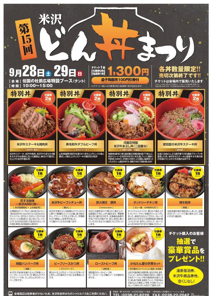 第11回なせばなる秋まつり第15回米沢どん丼まつり 9/28.29開催!会場 伝国の杜前広場時間 10:00〜15:00チケット 当日1300円(引換券2枚 抽選券1枚 益子陶器市100円引き券付き)特別丼、米沢牛や地元の食材を使用した豪華で多彩なオリジナル丼!ぜひご来場ください!