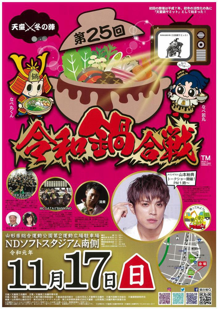 天童の名物冬イベント「平成鍋合戦」が「令和鍋合戦」になって11月17日にいよいよ開催!今年は約40のこだわりの鍋が出店します。鍋合戦の参戦方法は、鍋の中から好きな鍋を3つ食べて、一番おいしかった鍋に投票すること!参戦者による投票と審査員による実食審査で、今年の“鍋将軍”を決めます。約40の中から令和初の鍋将軍に選ばれる鍋をどれだ!?どれも美味しい鍋ばかりです。ぜひご参戦ください♪●アクセス情報場所は、モンテディオ山形のホームNDソフトスタジアムのある「山形県総合運動公園(天童市)」。当館から車で約7分と近いですが、当日駐車場は大変混み合いますので、当館ご宿泊のお客様は、当館駐車場に駐車しシャトルバスをご利用ください。当館から300mの「天童温泉協同組合」前停留所が最寄りのシャトルバス停留所です。●イベント詳細日にち:11月17日(日)場 所:NDソフトスタジアム南側(山形県総合運動公園第2運動広場駐車場、天童市)時間とゲストスケジュール:10:00〜開場10:30〜鍋販売開始10:45〜ステージイベント@創学館さん11:00〜ステージイベントAMPF☆Bさん11:30〜ステージイベントBMCGATAどBANKINGさん12:00〜ステージイベントCデアグランツさん12:30〜ステージイベントD清貴さん13:00〜ステージイベントE山本裕典さんトークショー13:30〜投票終了13:45〜投票結果発表14:00〜二次審査14:50〜審査結果発表・表彰公式サイト:https://nabegassen.com/美味求真の宿 天童ホテルhttps://www.tendohotel.co.jp/